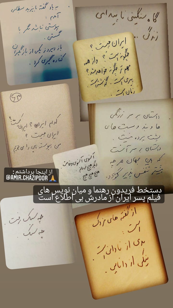 - از فیلم پسر ایران از مادرش بیاطلاع است. جایی که فریدون رهنما ( کارگردان فیلم) بجای بازیگر در فیلم حرف میزند؛ و هشدار میدهد که ایران دارد نابود میشود.